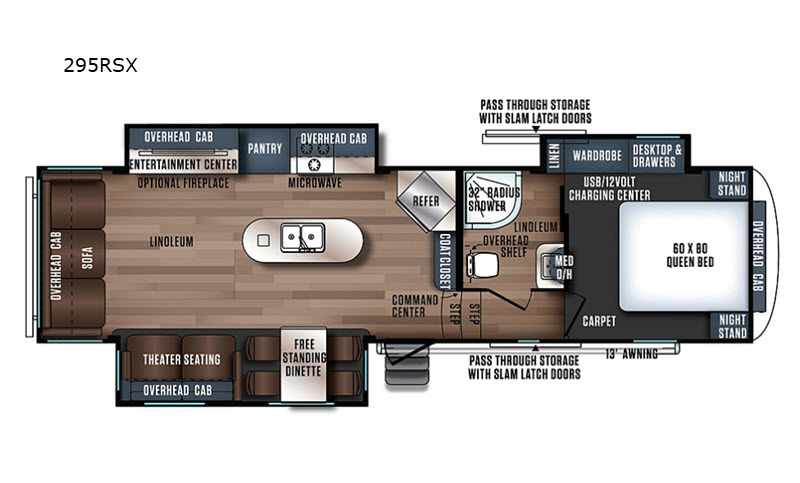 Nothing beats family time and with this fifth wheel, you can be sure to have a fun camping experience every time you take it out. The rear living area includes a sofa that is perfect for the kids or guests to sleep on, and everyone will love relaxing in the theater seats. The master suite offers a pillow-top residential queen bed, a wardrobe slide with a desktop and drawers as well as a linen cabinet that stretches into the bathroom. You will also feel right at home with the kitchen island, the free standing dinette, the pantry and the coat closet, plus there is an exterior pass through storage for all your outdoor gear!